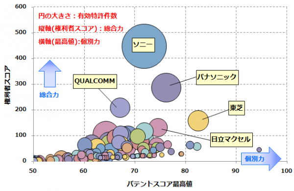 その結果、特許総合力ランキングは、1位 ソニー、2位 パナソニック、3位 QUALCOMMとなりました。