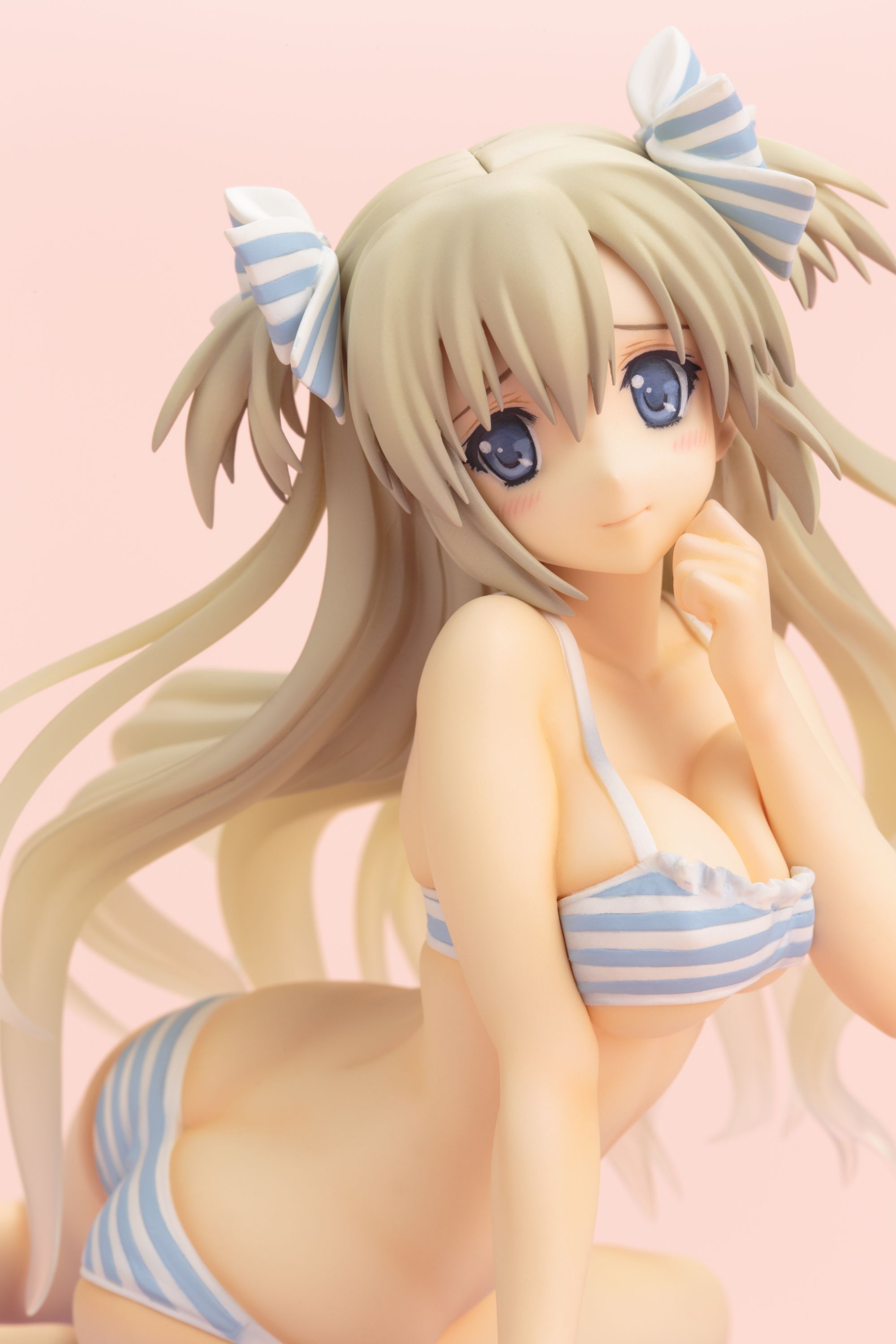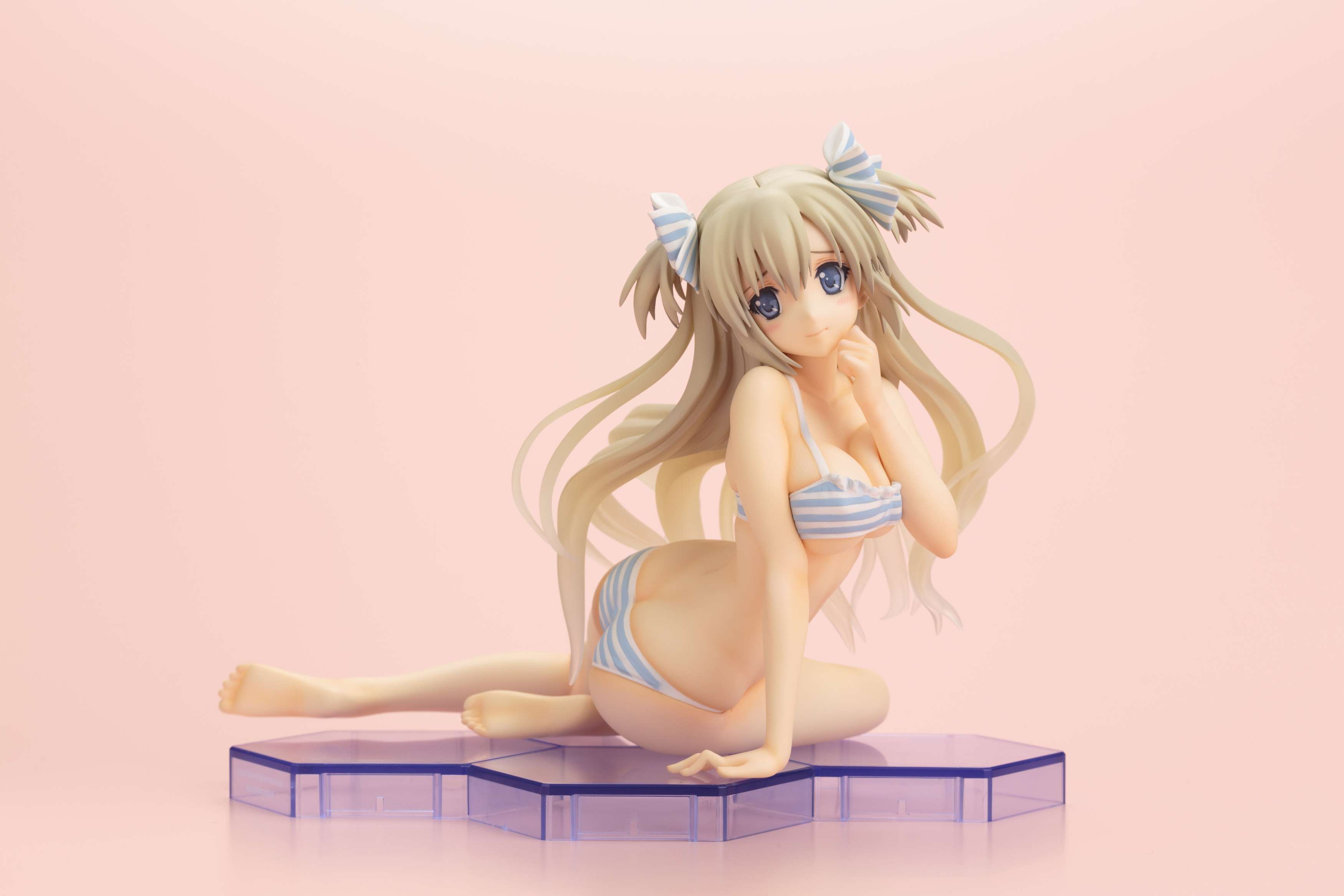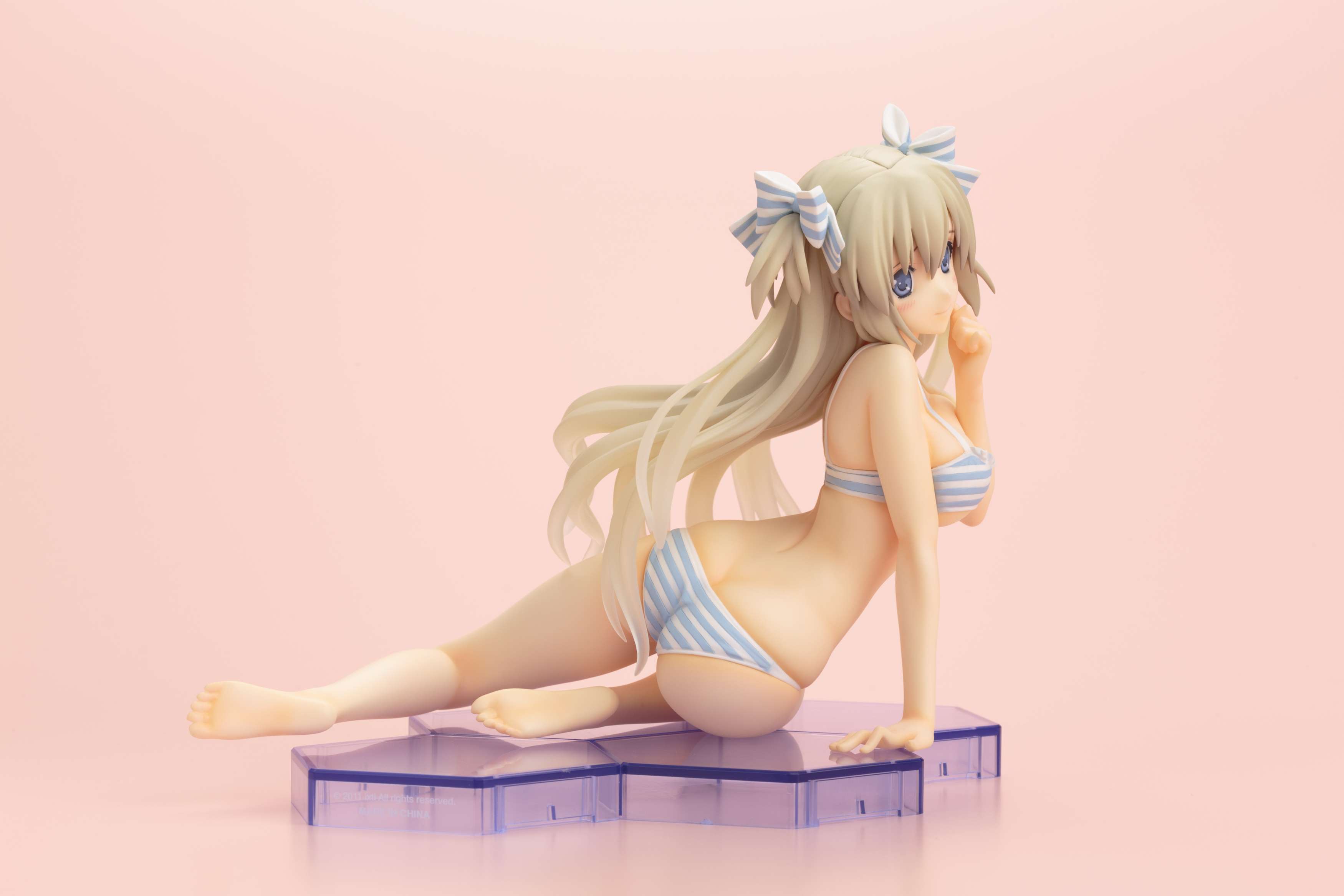キャラクターデザインとイラストを担当するCARNELIAN氏が描く、繊細な髪の流れや、少しおどけた可愛らしい顔立ちも丁寧に再現されております。トレードマークのリボンに合わせた水着や、張りのある女性らしい体型、腰のねじれが生み出すボディラインが美しい逸品です。