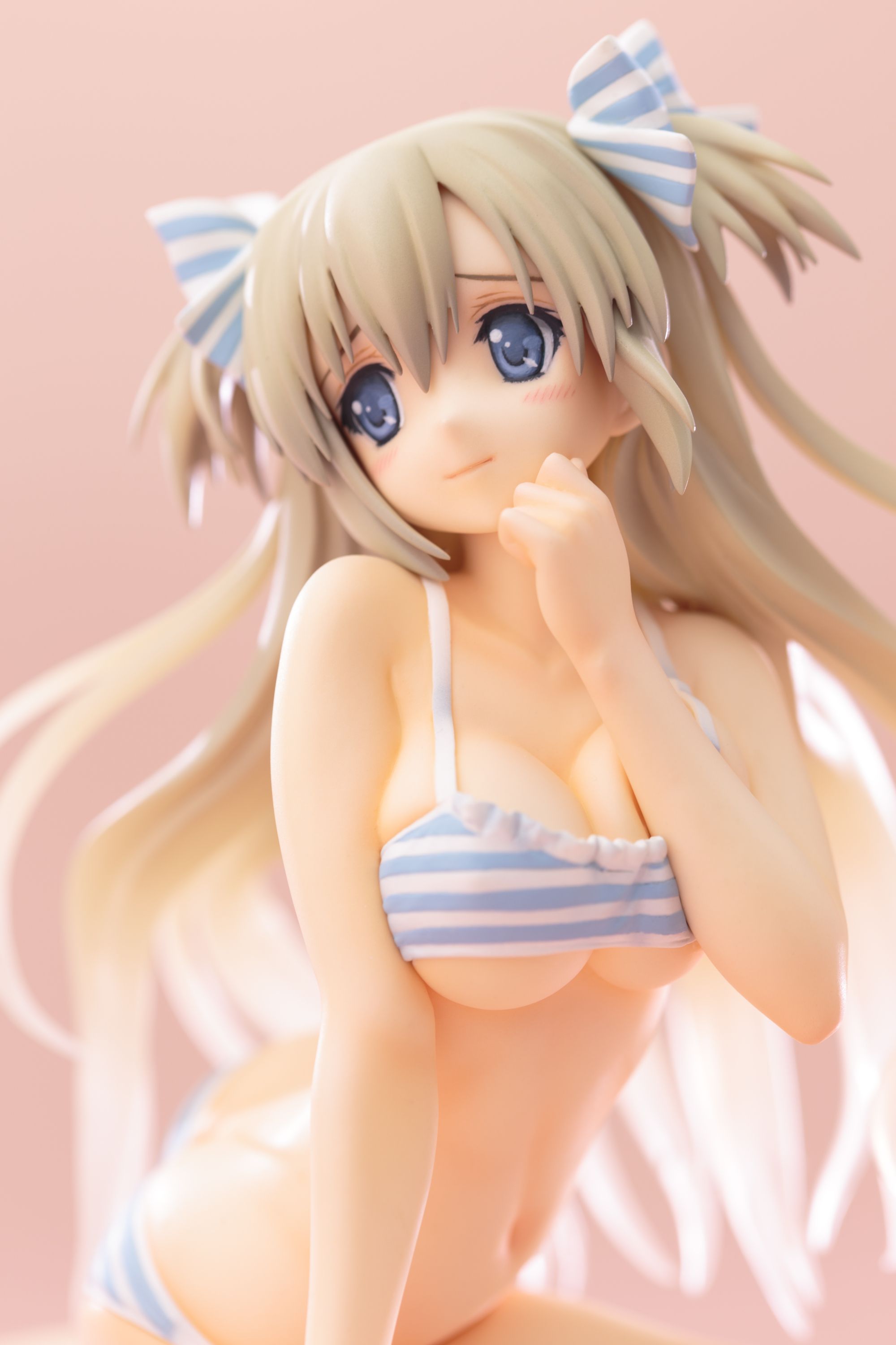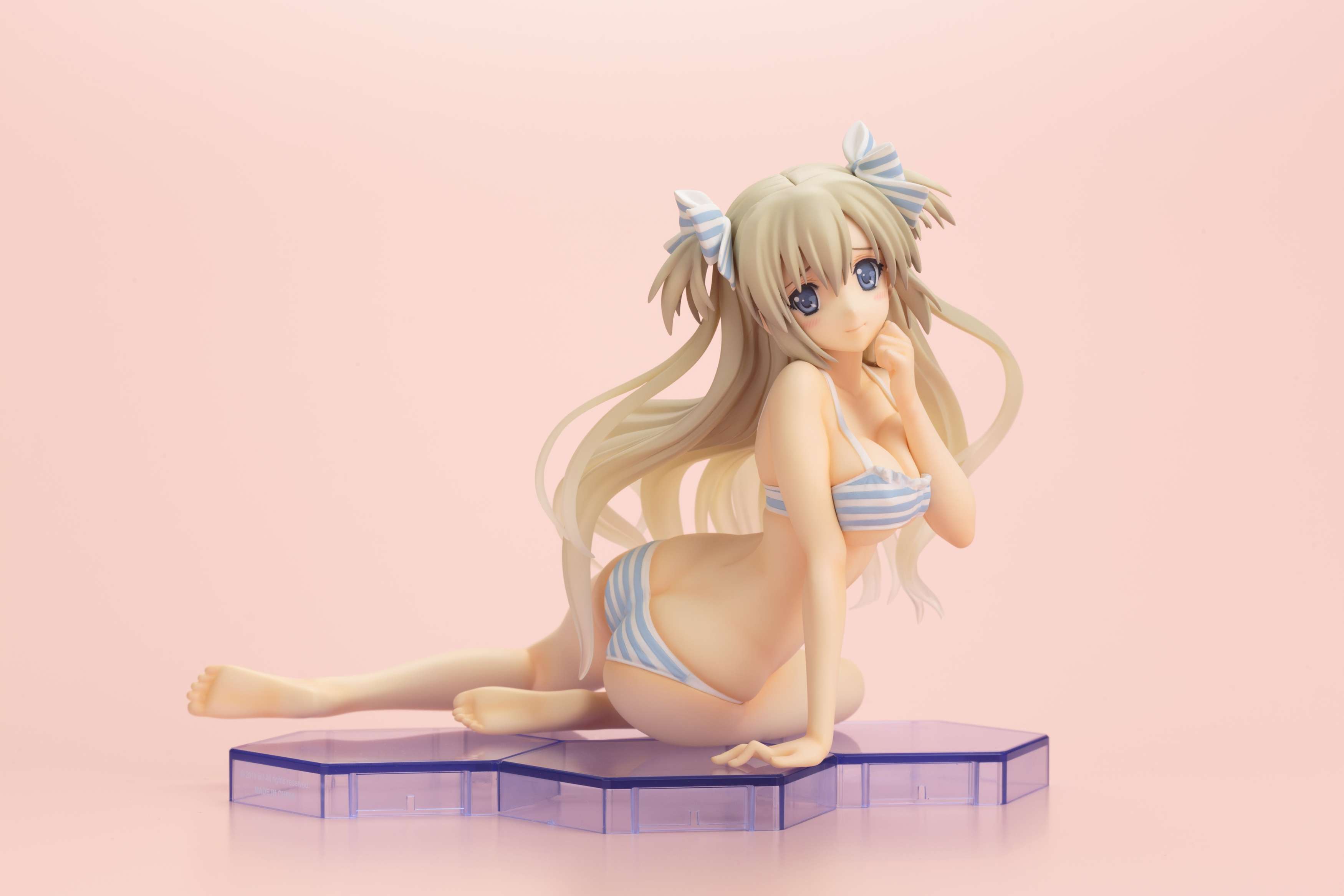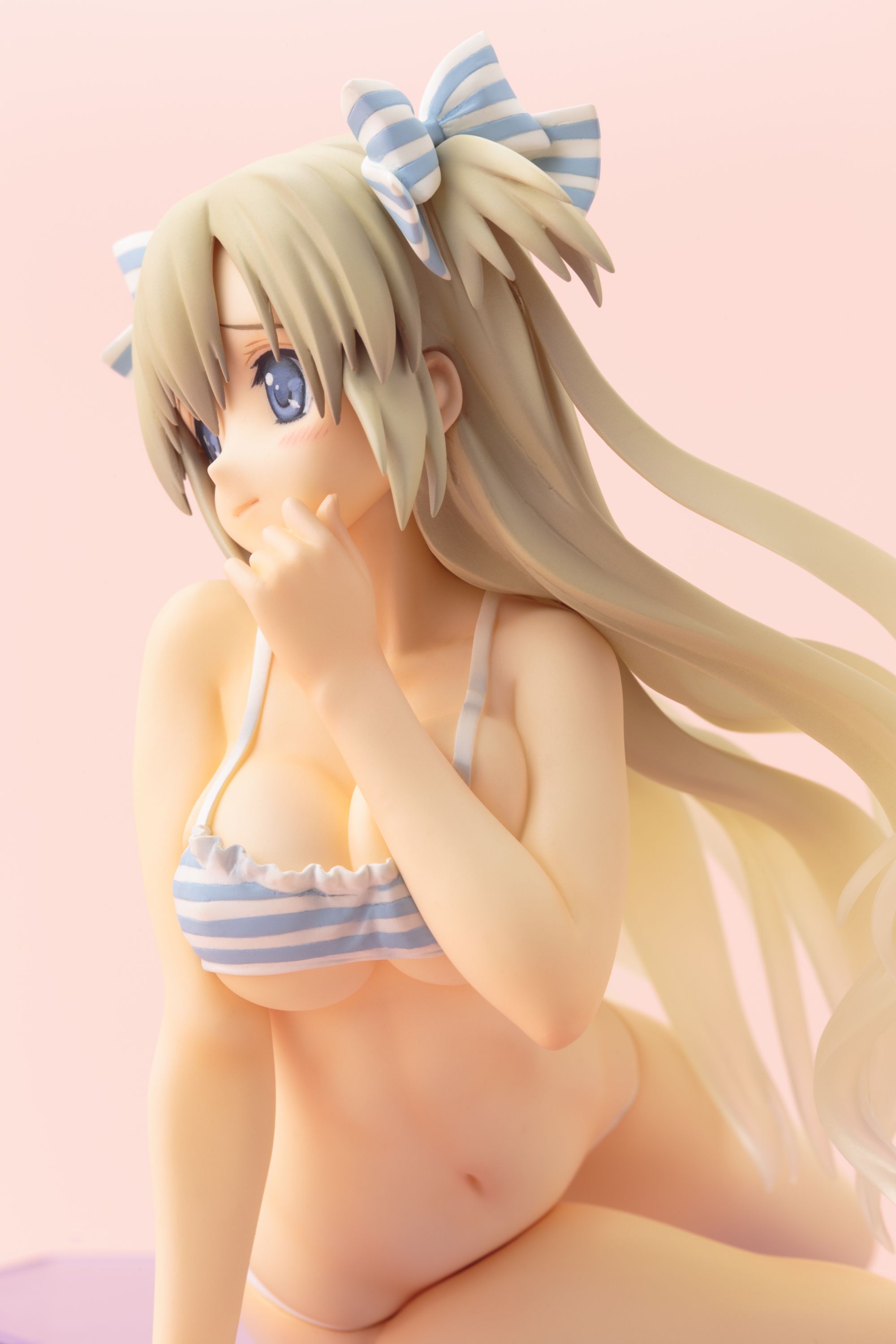 キャラクターデザインとイラストを担当するCARNELIAN氏が描く、繊細な髪の流れや、少しおどけた可愛らしい顔立ちも丁寧に再現されております。トレードマークのリボンに合わせた水着や、張りのある女性らしい体型、腰のねじれが生み出すボディラインが美しい逸品です。