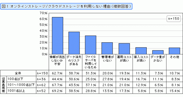 合わせて、利用していない方に対し、オンラインストレージ/クラウドストレージを利用しない理由を聞いてみたところ「情報が流出しないか不安」が62.7%、「データ消失のリスクがある」が38.7%、「ファイルサーバを利用しているため」が31.3%、「管理者がいない」が20.0%、「運用コストが高い」が19.3%と続きました。