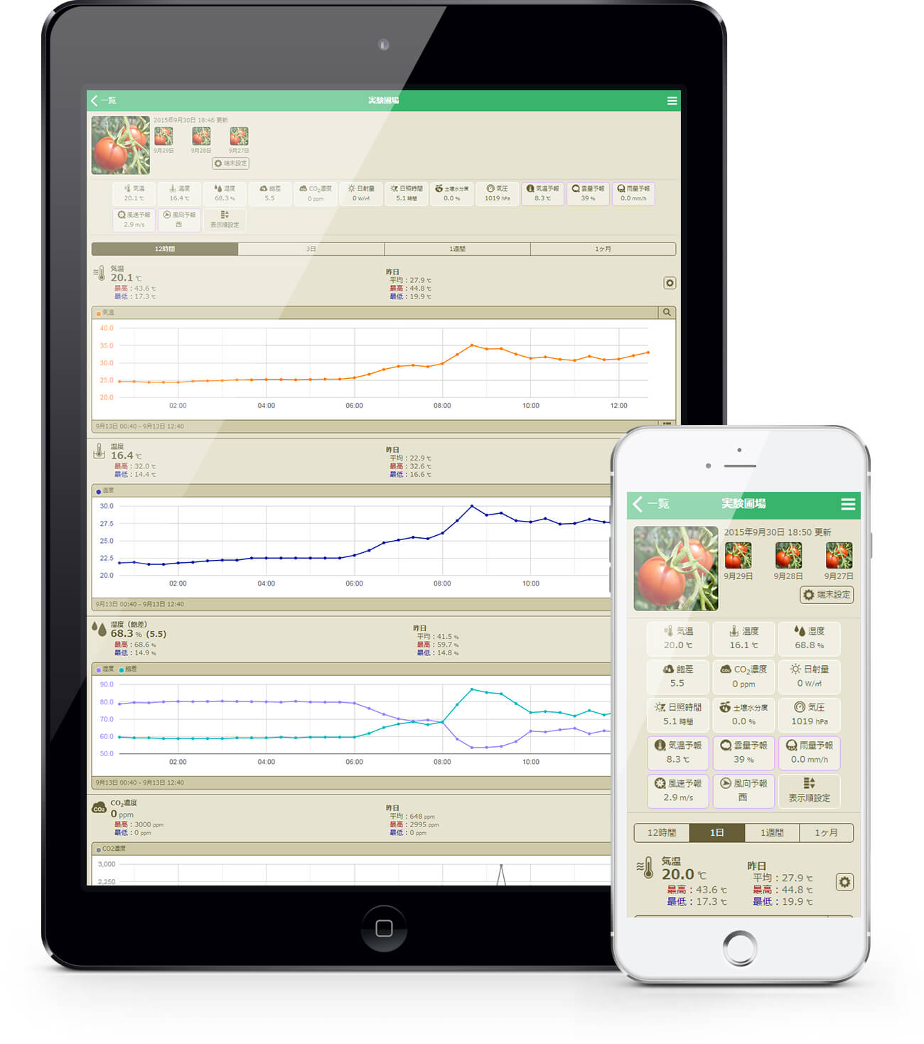 7種類の計測情報(温度・湿度・飽差・日射量・土壌水分・写真・CO2濃度)