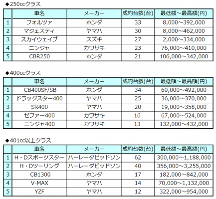 情報流通支援サービスの株式会社オークネット(本社:東京都港区/社長:藤崎清孝)は、2016年1月度のオークネットバイクオークションにおける成約台数を集計し、排気量別ランキングベスト5をまとめました。当ランキングは、全国4,000店の二輪販売店が、販売プロセスの一環であるオークネットバイクオークションを利用し、ご成約頂いた車両について、排気量別に分けて集計したものです。