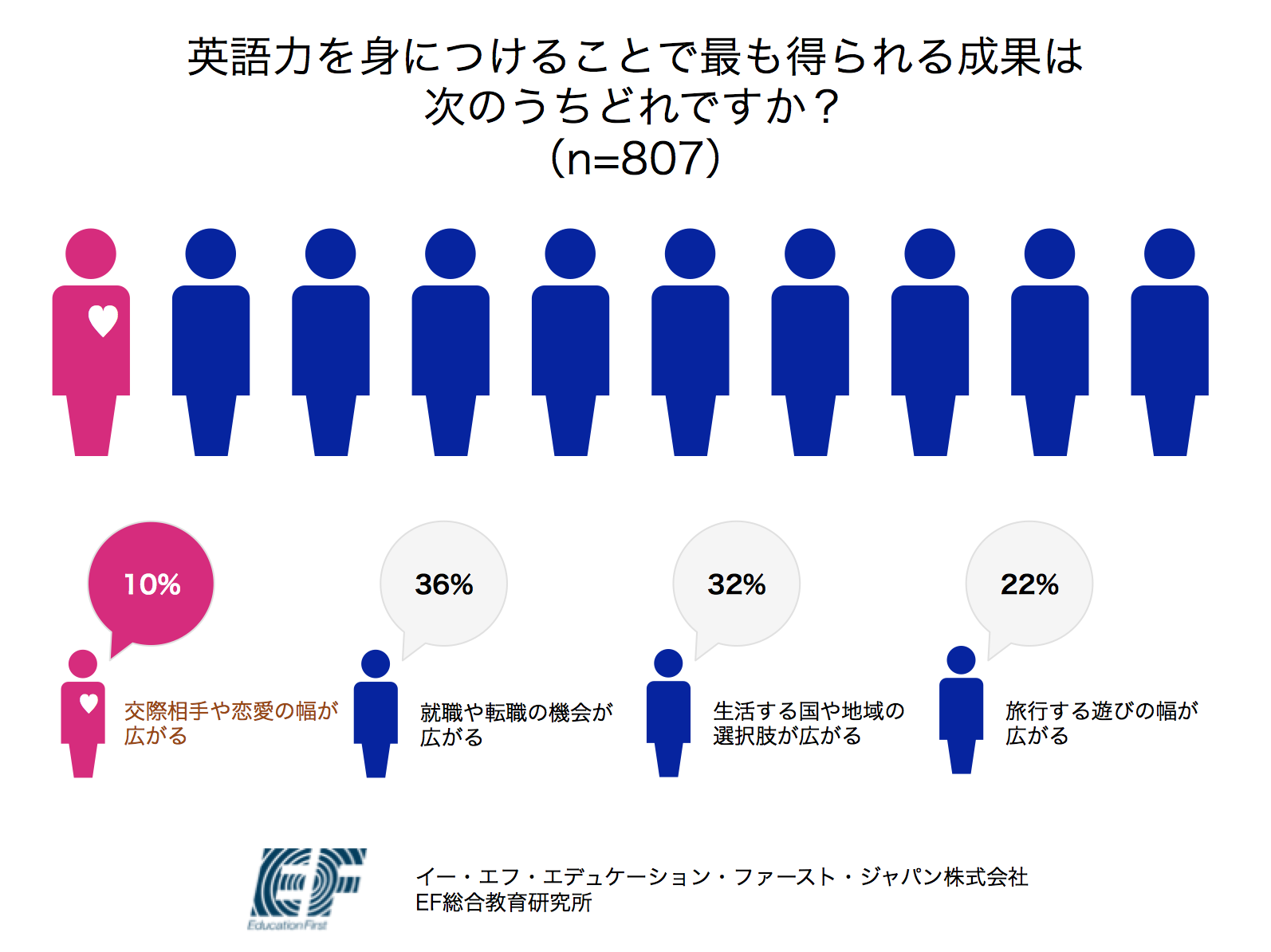 調査の結果、英語力を身につけることで最も得られる期待成果として一番高い割合になったのは “就職や転職の機会が広がる”(36%)でしたが、回答者の10%(10人に1人の割合)は、キャリアや旅行、移住よりも“交際相手や恋愛の幅が広がる”と回答しました。