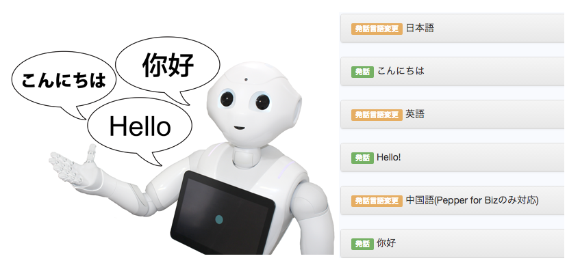 この度、既存の日本語・英語の会話設定に加え、Pepper for Biz向けに中国語での発話・聞き取り機能を追加しました。Webブラウザ上から簡単に中国語の会話の設定を行えますので、近年の訪日中国人増加の流れにおいて、より便利な接客が可能となります。