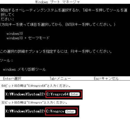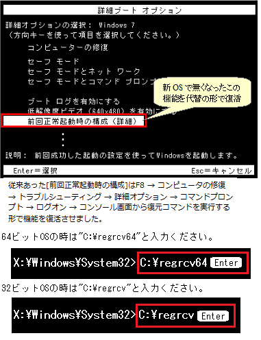 障害時はWindows7ライクなスタートアップ画面よりF8 → コンピュータの修復 → トラブルシューティング → 詳細オプション → コマンドプロンプト → ログオン → コンソール画面へ移動し、Ver2が備える復元コマンドを打つと[前回正常起動時の構成]に戻します。