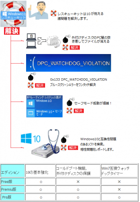 Safeモードの復活と、ブルースクリーンエラーBAD_POOL_HEADER (0x19)、CRITICAL_STRUCTURE_CORRUPTION (0x109) を起す可能性のあるWindows7のデバイスドライバをサーチします。Windows10で問題が起きそうなソフトを事前に調査してレポー トします。レポートに上がったソフトは最新版にアップデートするかアンインストールによりWindows10の信頼性を飛躍的に上げます。