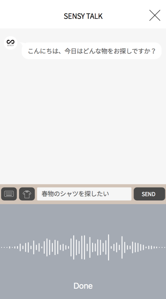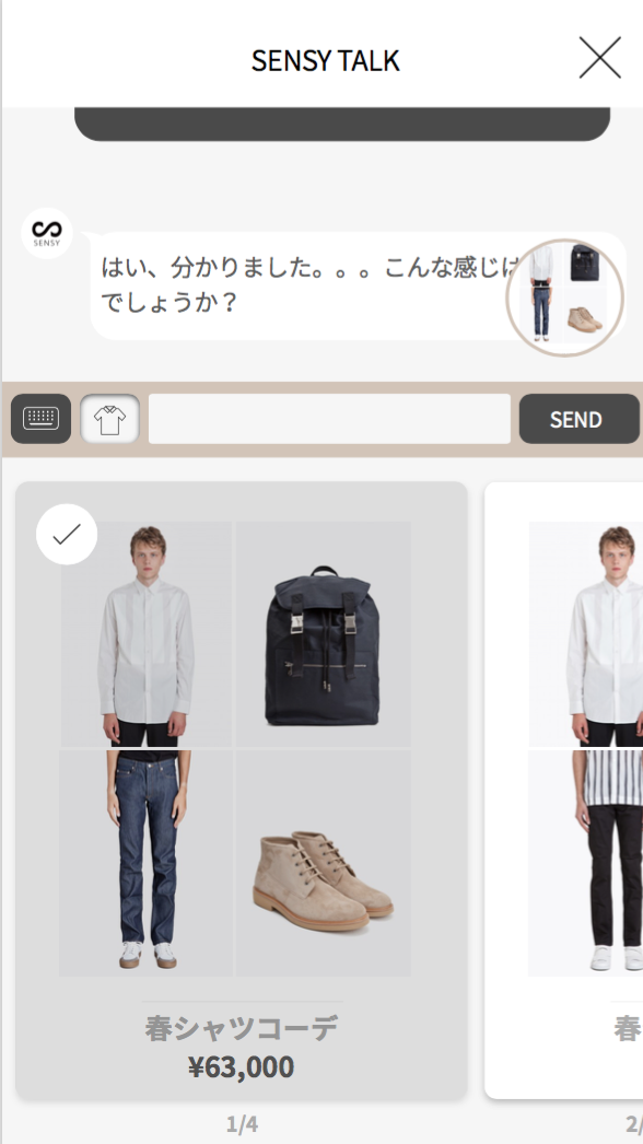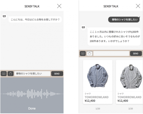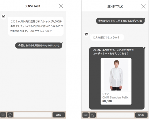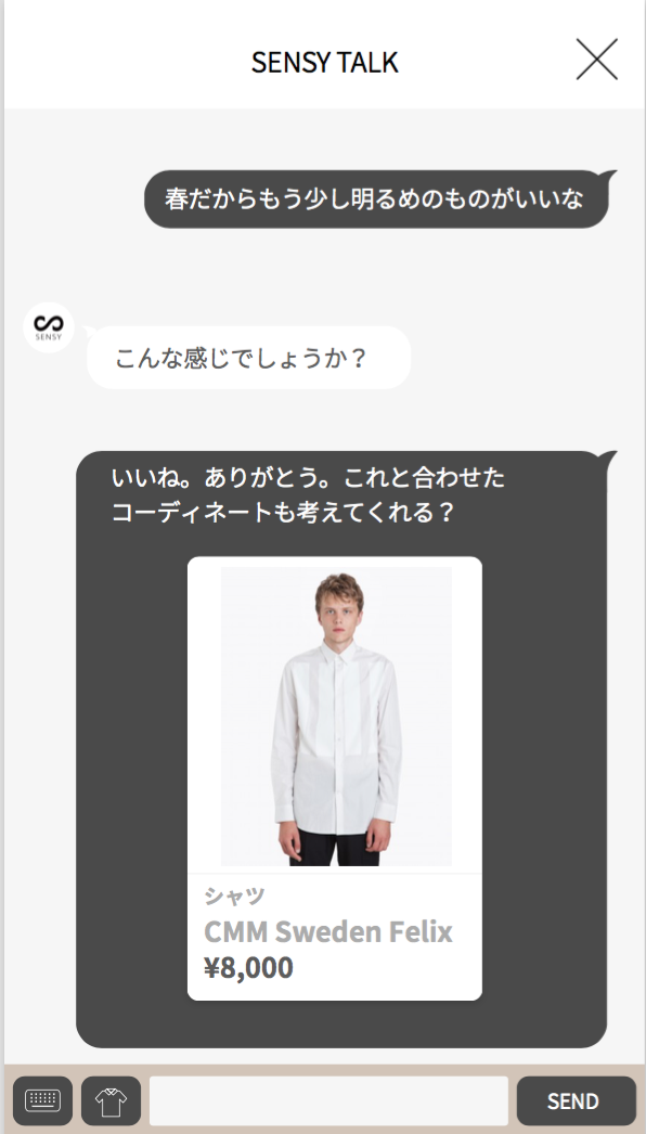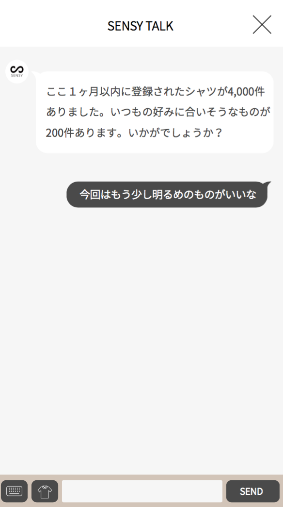 1人1人の好みを理解する人工知能「SENSY」は、下記のような「もう少し明るめ」や「春物」などの曖昧な言葉もパーソナルに理解し、その人の好みに合わせて、ファッションアイテムを提案していきます。