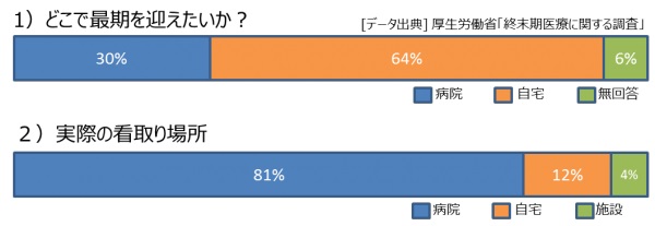 また、「最期は自宅で迎えたい」という方が6割以上なのに対して、実際は自宅で亡くなる方はわずか1割に留まっているというのが現代日本の状況です。