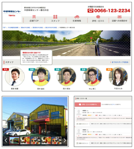 「車選び.com」の店舗詳細ページ上部にスタッフ一覧を設置。これにより、ユーザーは実際に店舗に行くときと同じような臨場感を味わえます。