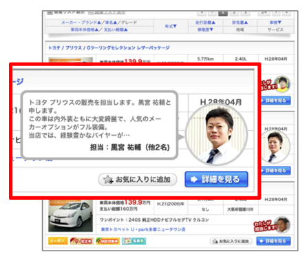 中古車は高価な買い物です。中古車を探しているユーザーが車を選ぶ時「どんな車なのか?」以外に「どんな人から買うのか?」も気になる情報です。『Staff Finder』はそんな声にお応えする機能です。