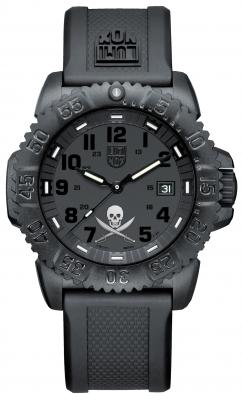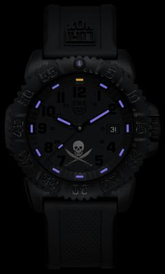 しかし、時代と共にそのエンブレムは「強さ」の象徴として、いくつものデザインへ変化を遂げながら海軍の一部チームのシンボルとして戦闘機などにも使用され、エンブレムのもつ恐怖に戦わずして降伏したとも言われています。ジョリーロジャーの伝説として語りつがれたそのヒストリーは、Luminoxのもつタフで強靭なヒストリーとリンクし、その魅力がより伝わる一本と言えます。今回人気のオールブラックをベースに、文字盤・裏蓋にそのエンブレムを施した世界375本限定モデルとして誕生することになりました。