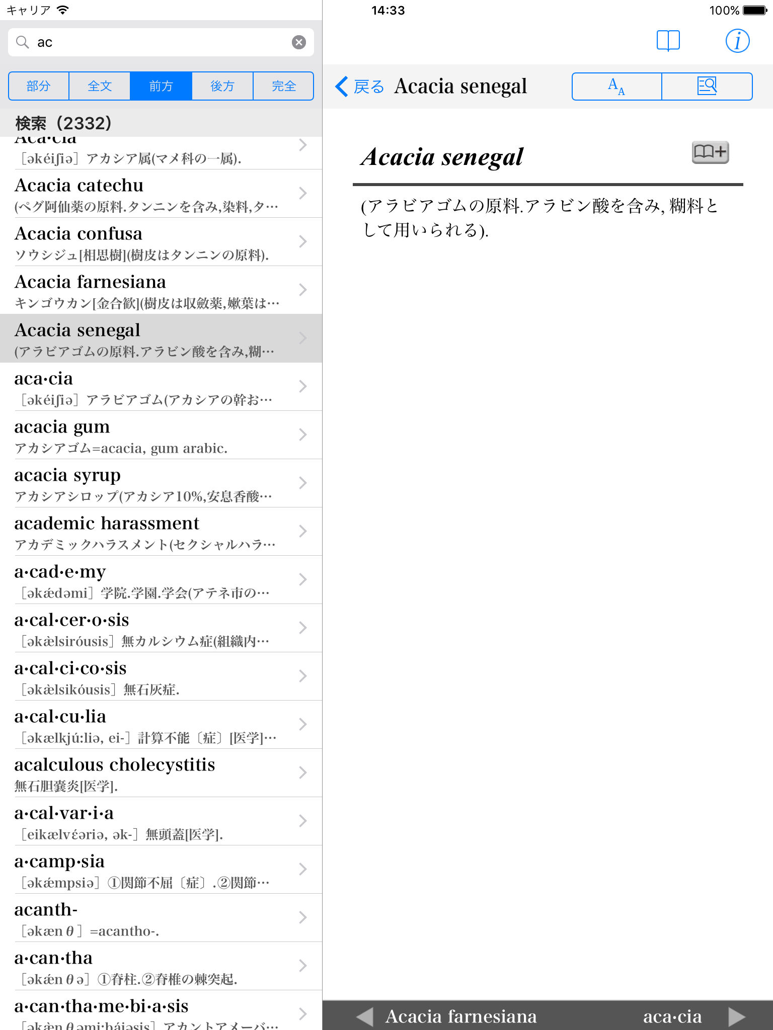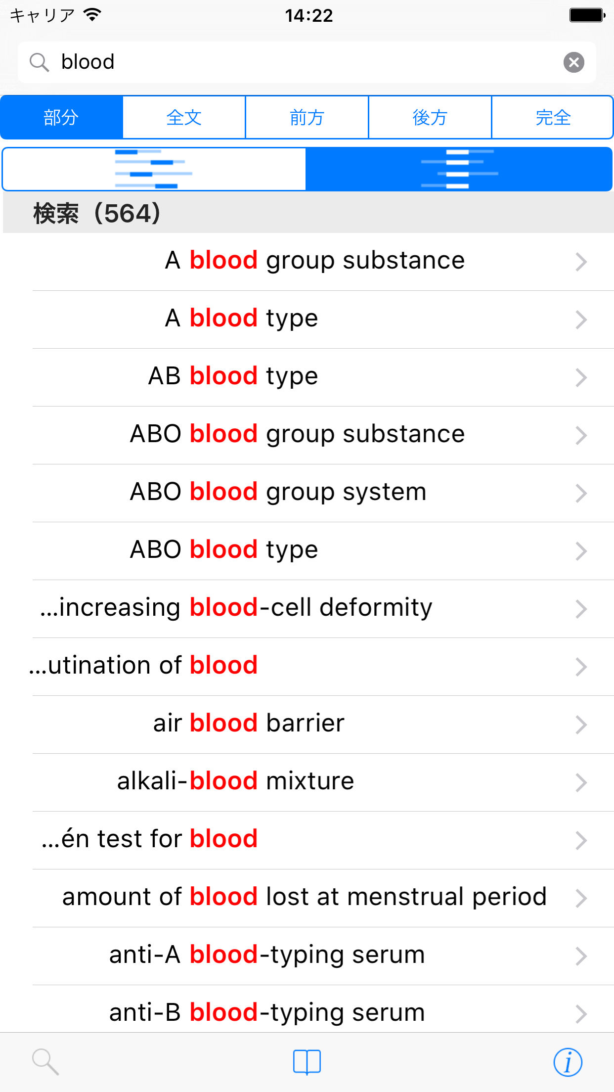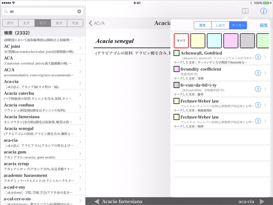 検索キーワードが見出し語(用語)のどの部分と一致したのか、分かりやすいように検索キーワードを中央に揃え、また色も変えて表示します。これによって難解な専門用語も直感的に探し出せます。