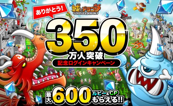 『城とドラゴン』の登録ユーザー数が350万人を突破したことを記念して、最大600ルビー&600CPが