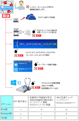 Safeモードの復活と、ブルースクリーンエラーBAD_POOL_HEADER (0x19)、CRITICAL_STRUCTURE_CORRUPTION (0x109) を起す可能性のあるWindows7のデバイスドライバをサーチします。Windows10で問題が起きそうなソフトを事前に調査してレポー トします。レポートに上がったソフトは最新版にアップデートするかアンインストールによりWindows10の信頼性を飛躍的に上げます。
