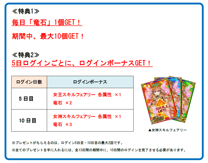 「女王スキルフェアリー」、10日目には「女神スキルフェアリー」をプレゼント!