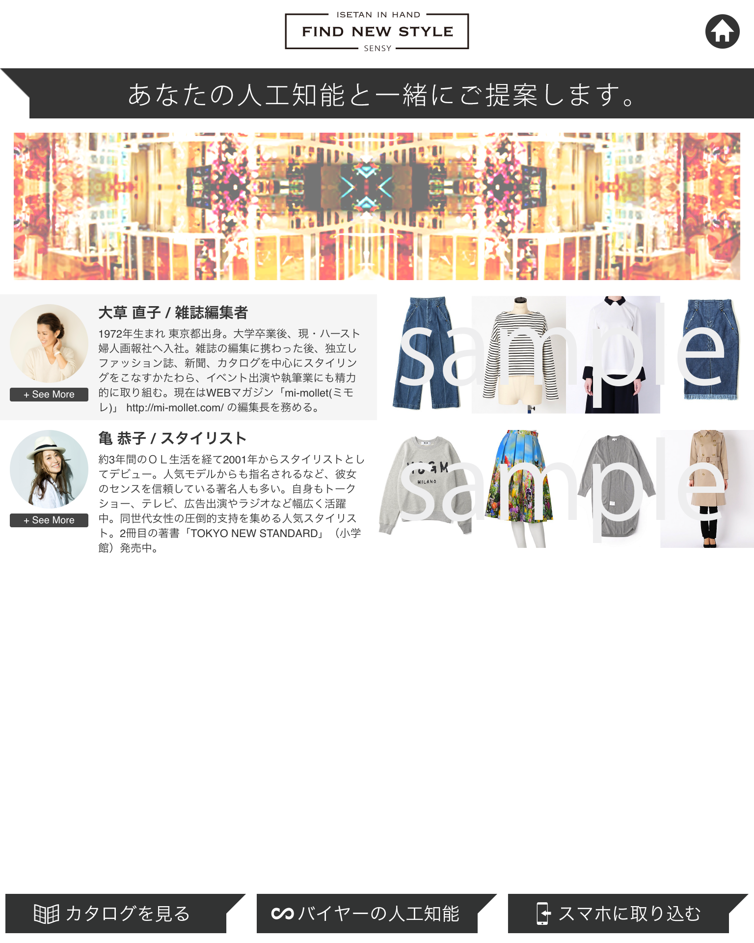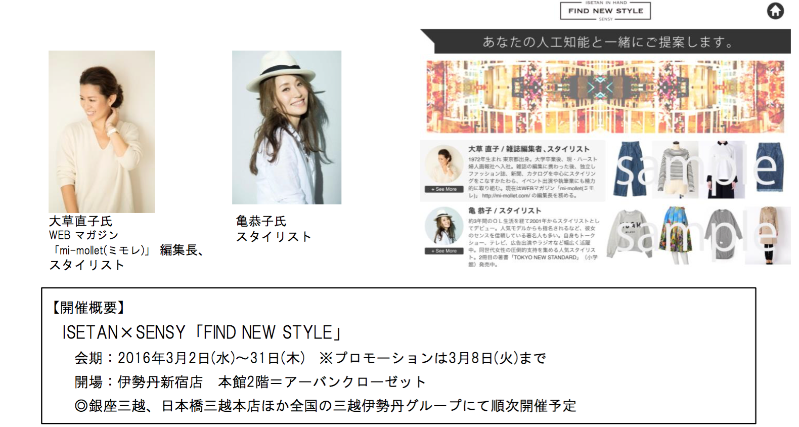 人気女性スタイリストの大草直子氏と亀恭子氏とコラボレーションし、両氏のスタイリングセンスを学習させた人工知能を搭載したオリジナルアプリを期間限定で体感できるプロモーションを伊勢丹新宿店本館2階=アーバンクローゼットで開催します。