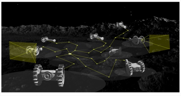 大型探査ロボット1台の場合と比較して、複数の小型探査ロボットを分散させて協調制御を行う分散協調型の宇宙探査システムは、複数ロボットの分散による“探査領域の広域化”、センシング、通信、運搬、マッピング、カメラなどの機能分散による“探査システムの多機能化”、個体トラブルなどの際の“探査システムのリスク分散化”といったメリットがあります。