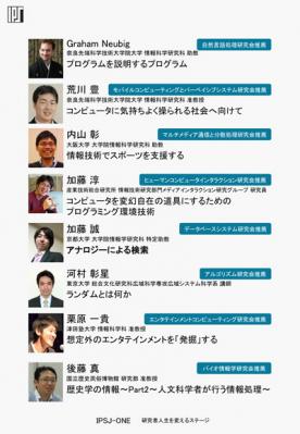 情報処理学会では、現在39分野の研究会にて各分野の専門家たちが日々議論を深めています。今回も昨年に引き続き、各研究会による推薦、IPSJ-ONE企画・実施委員会による審査により、分野を超えたインパクトを有する19名の気鋭の研究者を招待いたしました。それぞれ約5分の持ち時間でトークを行います。