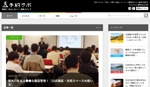 予約を軸に「ビジネス」「ノウハウ」「体験」「ニュース」と4つのカテゴリに分けて記事を配信します。