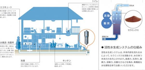「クラージュ エアリア」は、水の持つ本来の力を向上させる活性水生成システムを標準装備しております。システムの本体内部を流れる水によりセラミックスを流動させ、水の浸透力、洗浄力、脱臭力、溶解力、抗酸化力などを高めます。飲み水や料理に使用するのはもちろんのこと、お風呂での利用や、赤ちゃんやペットのいるご家庭にも安心してご利用いただくことができ、メンテナンスフリーの画期的なシステムです。