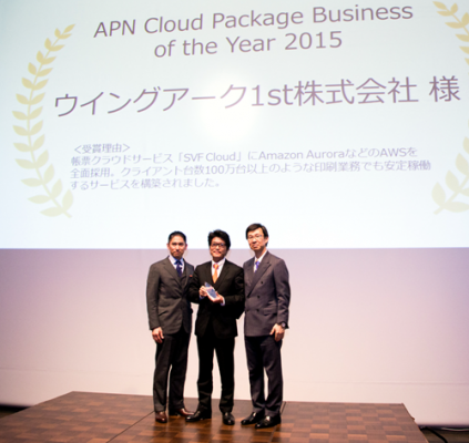 ウイングアーク1st株式会社(本社:東京都渋谷区、代表取締役社長CEO:内野弘幸)は、アマゾン ウェブ サービス ジャパン株式会社(本社:東京都目黒区、代表取締役社長:長崎忠雄)がアマゾン ウェブ サービス(以下、AWS)のパートナーを対象に1年間を通じた活動を表彰する「APN Partner Award 2015」において、「APN Cloud Package Business of the Year 2015」を受賞したことを本日発表します。「APN Cloud Package Business of the Year 2015」は、AWSの顧客に高い付加価値を提供し、市場拡大に寄与したPackage on AWS または SaaSを提供したパートナーに授与されます。