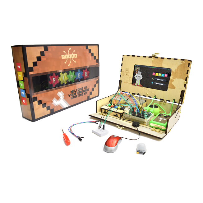 Piperは、人気ゲーム「マインクラフト」で電子工作を学ぶ、お子様向けの学習ツールボックスです。実際のブレッドボードを使った電子回路工作をマインクラフト上でミニチュア再現可能です。また、学習だけでなく通常のマインクラフトのゲームも楽しむことができます。すべてのパーツをゼロから組立てるエンジニアリングキット仕様により、コンピュータを組立てる工程を学ぶことができます。組立てに必要なラズベリーパイ、液晶モニタ、バッテリーなどがオールインワンとなり、届いたその日にマインクラフトを使って学習することができます。