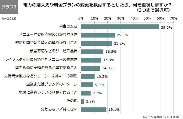 株式会社パイプドビッツ(東京都港区、代表取締役社長CEO 林哲也、東証1部パイプドHDグループ<証券コード3919>、以下「パイプドビッツ」)が運営する、政治・選挙情報サイト「政治山(せいじやま)」は、2016年2月26日から3月1日にかけて、全国の20歳以上の男女を対象に、電力の小売自由化に関する意識調査を実施し2,212名から回答を得ました。本日3月10日に「政治山」で調査結果のサマリー版を公開しましたので、お知らせいたします。