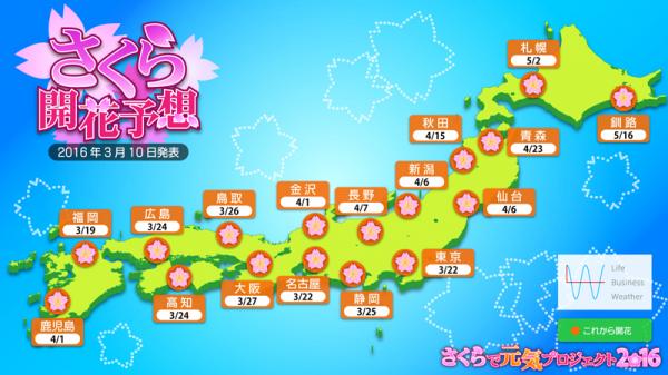 週末にかけては一時的に寒の戻りとなりますが、来週中頃からは、再び気温が上昇し春本番の陽気に。東・西日本の桜は開花に向けて順調に生長を続けるでしょう。開花トップは引き続き福岡で、3連休初日の3月19日、東京は3月22日頃の予想です。そのあと東・西日本は開花ラッシュとなりますが、3月後半は、また寒の戻りがあるかもしれません。開花から満開までは少し時間がかかる予想で、東・西日本は4月上旬に見頃となるでしょう。東北は平年より早く4月上旬から開花が始まり、開花前線は、5月はじめには札幌に到達しそうです。