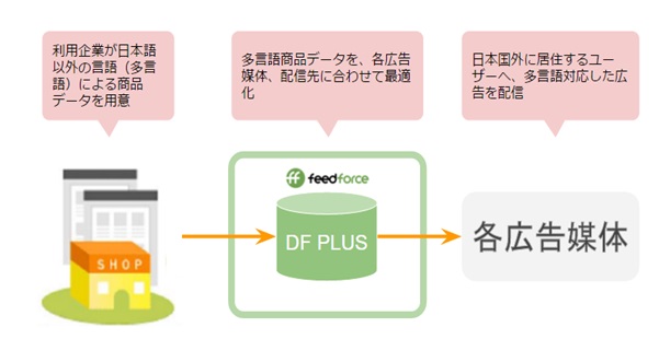上記の背景を受け、フィードフォースが「DF PLUS」に多言語対応機能を追加し、多言語での最適化配信に対応したデータフィードサービスを開発しました。