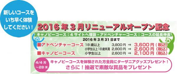 『TARZANIA』では、今回のリニューアルオープンを記念して「新しいコースをいち早く体験してもらいたい」との思いから、3月中の来場者には料金据え置きで対応するということです。また、4月4日~28日に新しい「キャノピーコース」を体験されたお客様にはもれなくターザニアグッズをプレゼントという企画も予定されています。