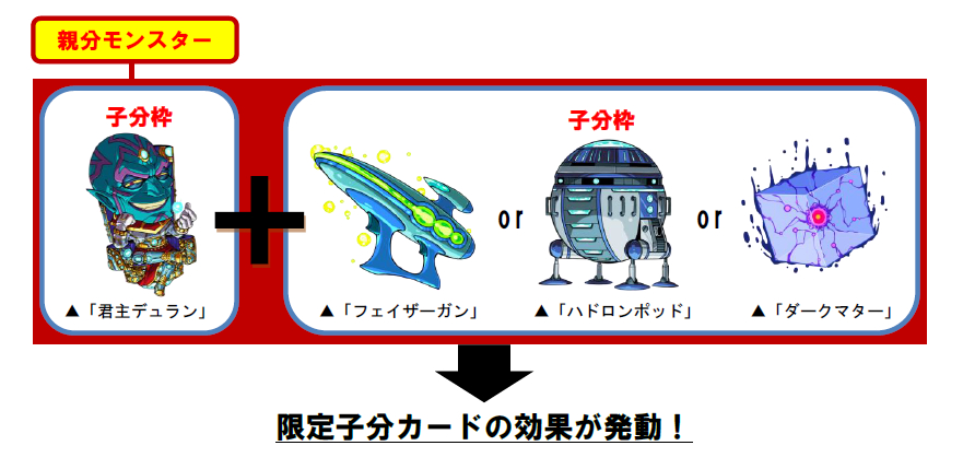 これら3 種の子分カードを、同じモンスターの子分として同時に装備させると、その限定子分カードの