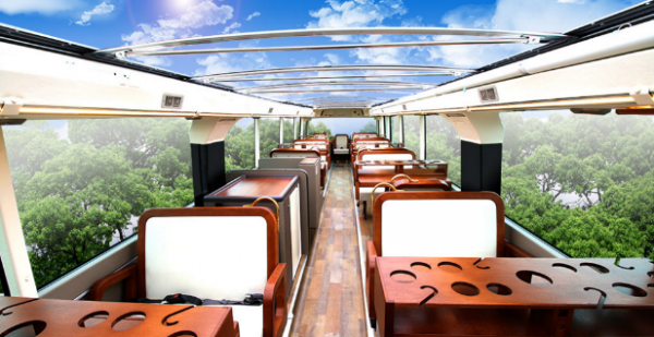 レストランバスは、1階に料理が作れるキッチンが配備され、2階には乗客25人が着席できる座席とテーブルが設置されています。さらに天井が開閉式の透明 の屋根になっており、暖かな天気の良い日にはオープントップで開放的な景色を楽しめます。天候が悪い日には透明の屋根を閉め景色を楽しみながら快適に食事 ができます。