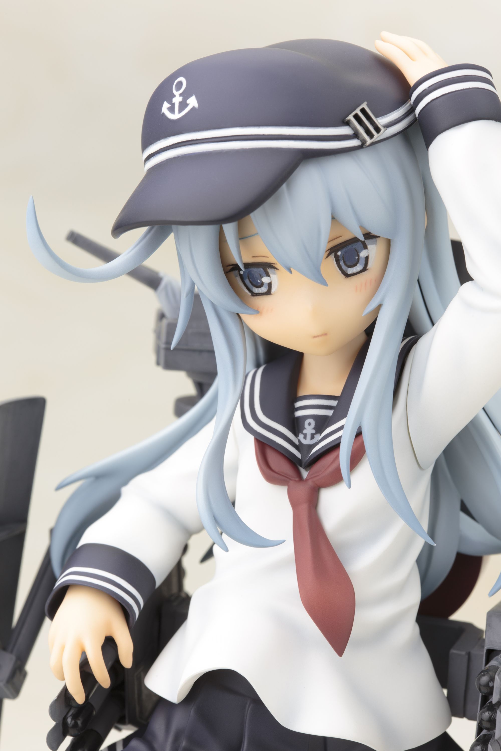 可愛らしいキャラクターデザインや艤装細部もアニメ設定を再現し、達観したような澄ました表情と凛々しいとポージングは、「不沈艦」とよばれた「響」らしさが表現されています。艤装はシールドや三連装魚雷・連装砲が可動。細部まで精密な造形と、重厚感のある塗装で仕上げました。帽子は着脱可能です。へックス構造のクリアベースは好評発売中の同型姉妹艦の「雷(いかずち)」「電(いなづま)」と接続可能。