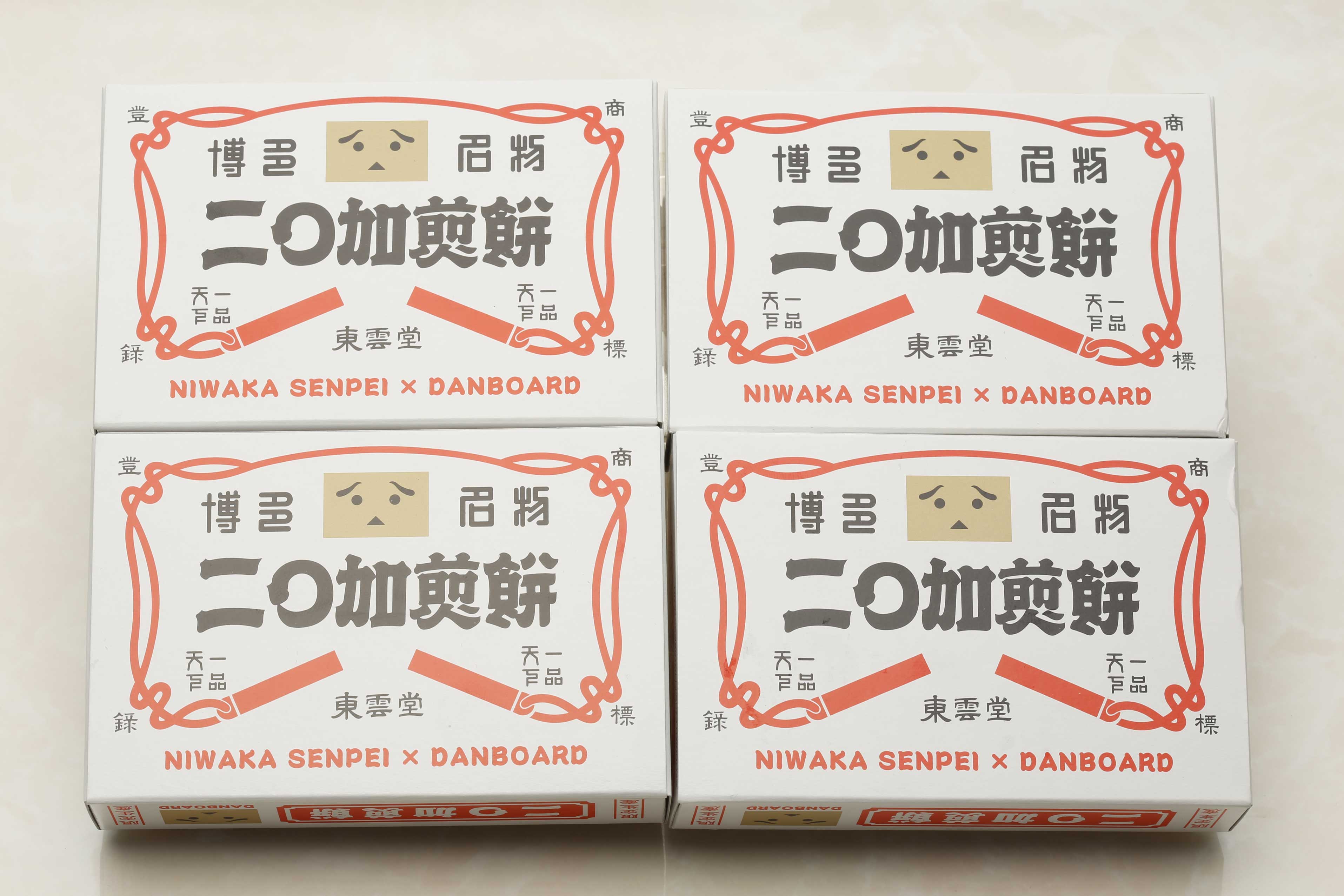 東雲堂は、「二◯加せんぺい」をはじめ、「にわかもなか」「丸ぼうろ」など、地元九州をはじめ、観光客のお土産としても長年支持されています。今回、発売する「DANBOARD」二〇加せんぺいは、東雲堂が明治39年の創業以来製造し続けている「二○加せんぺい」を、「ダンボー」モチーフのデザインに仕上げたもの。パッケージの表は二〇加せんべいの特長である眉毛を付けたダンボーをあしらい、裏や側面は二〇加せんべいの意匠を活かしたコラボデザインに仕上げました。また、「二○加せんぺい」でお馴染みのお面も、ダンボーコラボデザインされたものが封入されます。2016年3月17日(木)から、福岡県内の東雲堂直営店のほか、商品を取り扱っている福岡県内の一部店舗にて、限定生産で販売します。