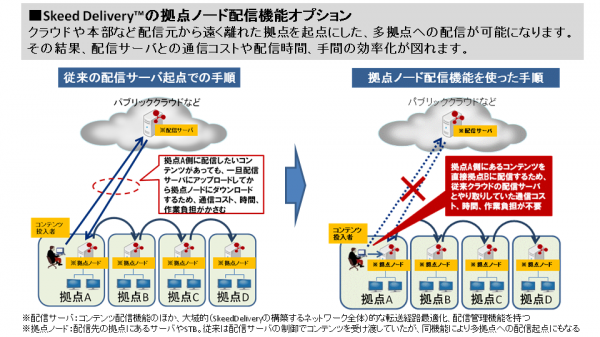 今回の機能拡張では、このグローバル対応強化の方向をさらに推し進め、従来、配信サーバに集約していたコンテンツ配信機能を配信先となる拠点ノード(拠点側のサーバなど)にも付与し、予め設定した特定の拠点ノードから他の各拠点に配信できるようになりました※2。(下図参照)