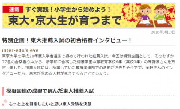 受験教育サイトを運営する株式会社インターエデュ・ドットコム(本社・東京都新宿区)は同名のサイト上で、3/17(木)に東大推薦入試の初合格者に取材をした内容を、「東大・京大が育つまで」の特別企画として公開しました。