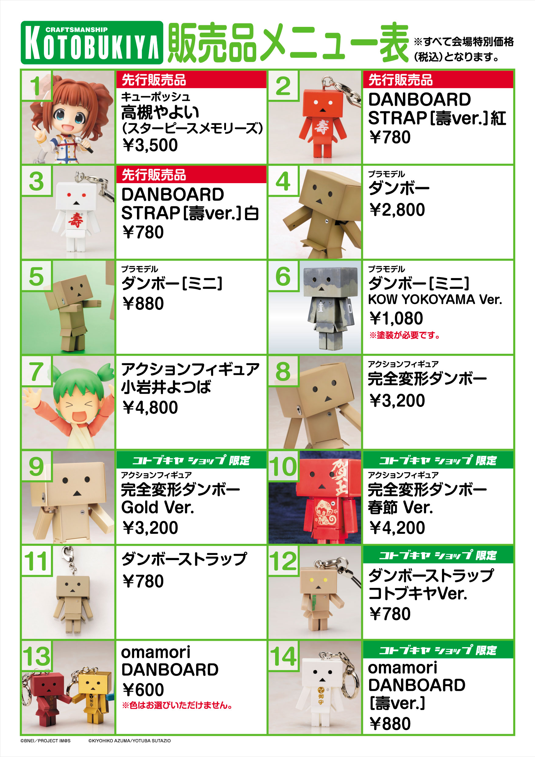 3度目の出展となるアニメジャパンのコトブキヤブースでは、『THE IDOLM@STER MOVIE 輝きの向こう側へ!』より「キューポッシュ 高槻やよい(スターピースメモリーズ)」、『よつばと!』より「DANBOARD STRAP[壽 ver.]紅/白」を先行販売いたします。いずれも4月に発売予定の一部店舗限定品です。