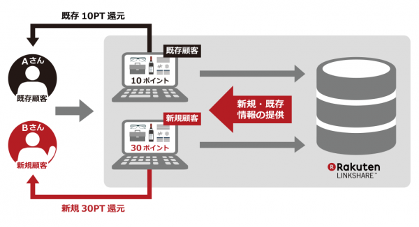 リンクシェア・ジャパンは、「リンクシェア アフィリエイト」を通じて蓄積しているアフィリエイト広告経由でのユーザーの購買行動分析から、サイト訪問者が広告主の新規顧客か既存顧客かどうかの区分情報をWebブラウザー別で保有しています。今回、「NX1」サービスの対象となるアフィリエイトサイトには、この区分情報が連携されています。これら対象サイトに出稿する広告主は、「NX1」を利用することにより、訪れるユーザーが新規顧客かどうかに応じて、サイトに表示する広告を変えることができます。これにより広告主は、例えば新規顧客か既存顧客かに応じてポイントを変えて訴求する広告を表示させるなどの施策を講じることが可能となります。