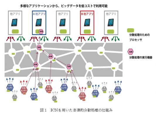 今回の実験は総務省の戦略的情報通信研究開発推進事業として取り組んでいるもので、情報指向ネットワークICN技術と自律的分散処理技術を用いて、多数の情報機器から得られる情報を分析処理する時に課題となる、データの収集のための通信ネットワークコストの大幅な削減と、分析に使用する計算装置のコストを削減することを可能とするものです。これは機器から集めた情報を、中央の大型計算機でまとめて分析処理する方式に対し、多数の機器が処理を分担し全体として目的の分析処理を実現するものでエッジコンピューティングとも呼ばれています。