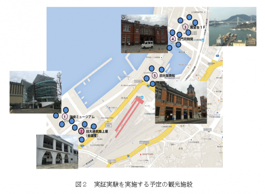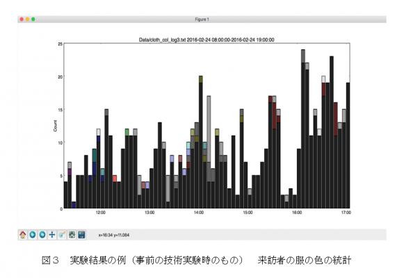 2016年2月に実施した実証実験では、同システムを用いて観光地(北九州市門司区、門司港観光地区)における来訪者属性の分析実験を実施し機能と運用性を確認しました。地区内の観光施設にWiFiや携帯電話網で接続された20台のコンピュータ機器を分散配置し、さらに各コンピュータ装置にはセンサーとしてカメラを接続。各コンピュータのカメラでとらえた画像から人を検出し、その服の色をその特徴を表す値の例として収集し、その統計計算に成功しました。