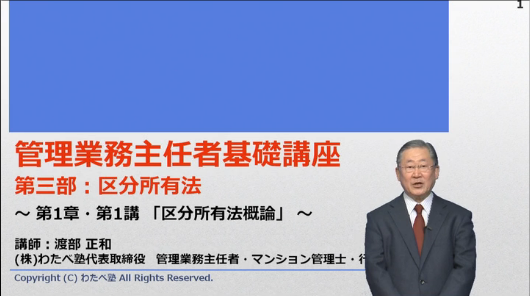 本講座では、マンション管理士として実務家として活躍され、受験対策講座の第一人者でもある、わたべ塾の渡部正和先生が、まず合格に必要な最低限の基礎知識を解かりやすく講義いたします。