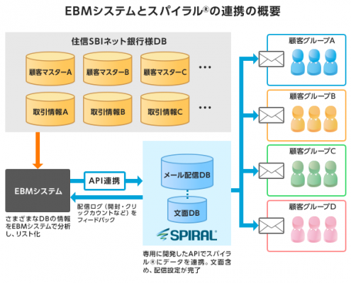 株式会社パイプドビッツ(東京都港区、代表取締役社長CEO 林哲也、東証1部パイプドHDグループ<証券コード3919>、以下「パイプドビッツ」)は、住信SBIネット銀行株式会社(東京都港区、代表取締役社長 円山法昭、以下「住信SBIネット銀行」)が、メールマーケティングの効率化のために「スパイラル(R)」とEBM(※1)システムを専用APIで連携したインタビュー記事を、本日2016年3月25日に公開しましたので、お知らせいたします。