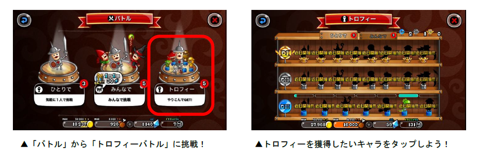 「トロフィーバトル」は、各キャラのトロフィー獲得を目指して、全国のプレイヤーとバトルを行ないます。