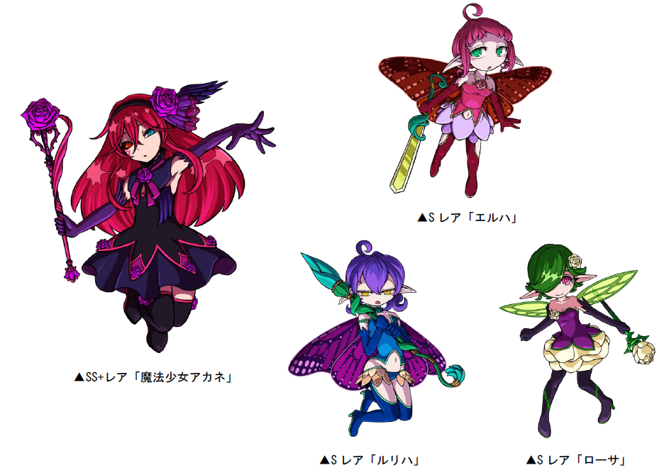 SS+レア「魔法少女アカネ」、Sレア「エルハ」「ルリハ」「ローサ」と交換することができます。