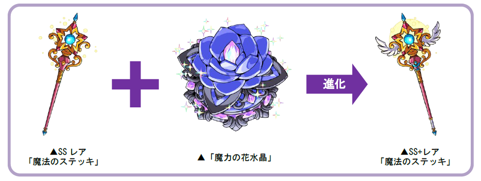 ※進化素材「魔力の花水晶」は、強化素材「魔法のステッキ」をSS+レア以上に進化させる際に必要となります。