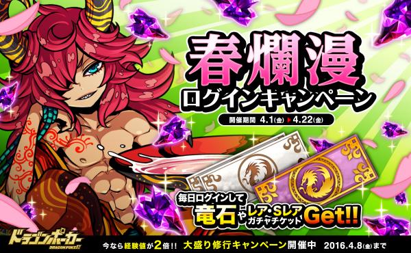 期間中、ゲームにログインすると、最大20日間「竜石」が1日1個もらえる「春爛漫ログインキャンペーン」を