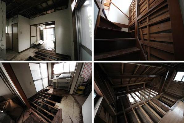 現在、こちらの物件は壁や床を剥がし、下地、柱、梁、基礎までご覧頂ける状態になっています。壁の内部のシロアリ被害、屋根からの漏水で傷んだ野地板、筋違を貫通してしまっているエアコン配管、なんとも頼りない補強金物・・・などなど、開けてみないと確認できない戸建て物件の構造内部をご覧いただける貴重な機会になっています。