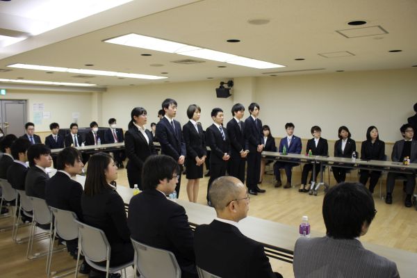 新入社員には社章と名刺が手渡され、それぞれが新社会人となった決意を発表した後、先輩社員より歓迎と激励の言葉が贈られました。