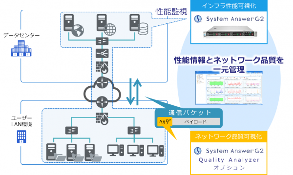 「System Answer G2 Quality Analyzerオプション」は、お客様サイトのネットワークを流れるパケットをキャプチャーすることによって、トラフィック量や品質状況(パケットロス率/RTT/アプリケーション遅延/コネクション数)をグラフ化し、分かりやすいビジュアルで表示します。さらに「System Answer G2」の分析機能を使用することでリアルタイム分析が可能になります。