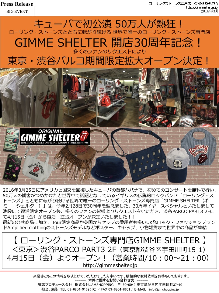 2016年3月25日にアメリカと国交を回復したキューバの首都ハバナで、初めてのコンサートを無料で行い、50万人の観客がつめかけたと世界中で話題となっているイギリスの伝説的ロックバンド「ローリング・ストーンズ」とともに転がり続ける世界で唯一のローリング・ストーンズ専門店「GIMME SHELTER(ギミー・シェルター)」は、今年2月28日で30周年を迎えました。30周年イヤースペシャルといたしまして池袋にて復活限定オープン後、多くのファンの皆様よりリクエストをいただき、渋谷PARCO PART3 2Fにて4月15日(金)から復活・拡張オープンが決定いたしました!!